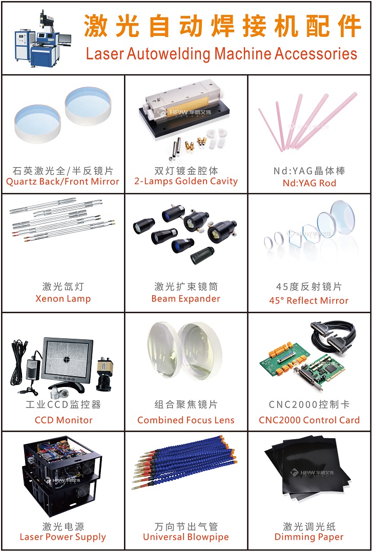 Laser auto welding machine spare parts and consumables -Quartz complete reflecting mirror/half reflecting mirror (Front and rear mirror) -Golden cavity -Nd:YAG crystal rod -Xenon lamp -Beam expander -45 degrees reflecting mirror -CCD monito...